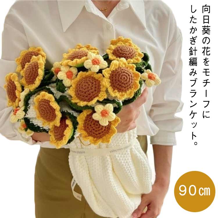 太陽のような笑顔を運ぶヒマワリの手編みニット。花束ブランケット完成品 90cm 向日葵 膝掛け マルチクロス 洗える ギフト