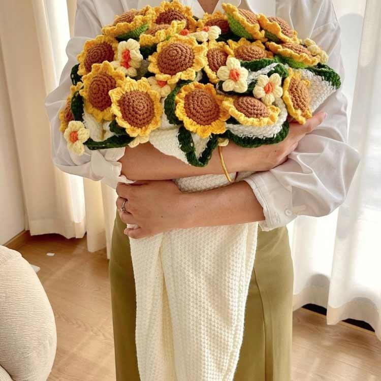 太陽のような笑顔を運ぶヒマワリの手編みニット。花束ブランケット完成品 90cm 向日葵 膝掛け マルチクロス 洗える ギフト